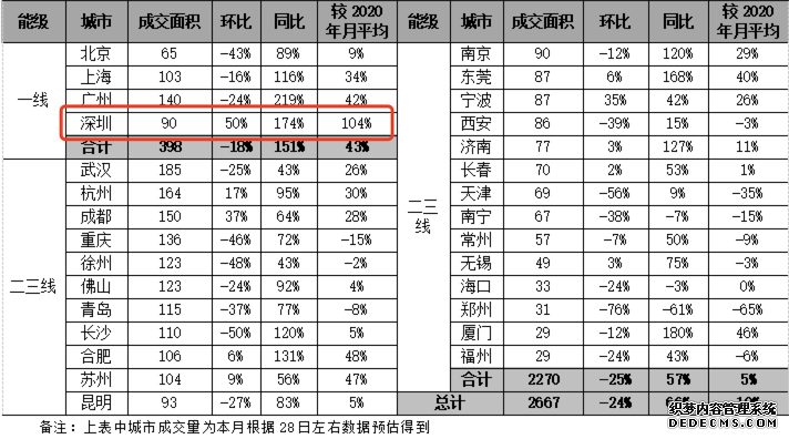 其中一线城市成交398万平方米,环比下降18%,同比增长151%,较2020年月均增长43%。深圳前期火爆打新的“网红盘”集中网签备案,成交面积一举刷新近年来单月新高,环比大增50%,较去年月均更是倍增达104%。